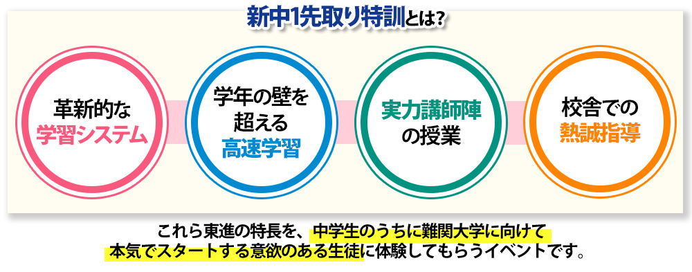 数学が得意な生徒を対象に、先取りで中学範囲を完成させ、最難関大学合格へ最高のスタートを切っていく講座です。中学受験で培った算数の能力を生かしつつ、数学で必要な力を自然に身につけていきます。