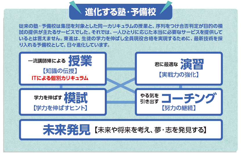 東進では、生徒一人ひとりの夢を育み、人生を賭けて成し遂げたいという志に昇華させるとともにどのような未来でも逞しく生き抜く力と次代のリーダーとして活躍するための素養を身につける指導を行っています。